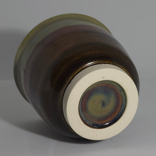 Wheel-thrown with porcelain clay. The interior has a partial satin matte on the top that overlaps with another glaze towards the bottom of the cup. Seaweed is used on the upper half of the exterior and Textured Amber Brown on the bottom half. High fired at cone 5.